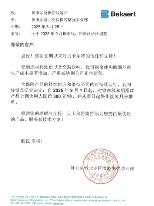值得關(guān)注的是,在發(fā)布限產(chǎn)通知的同一時(shí)期,貝卡爾特北亞區(qū)橡膠增強(qiáng)事業(yè)部也向客戶發(fā)出另一份關(guān)鍵通知,宣布自 2025 年 9 月 1 日起,對(duì)鋼簾線和胎圈絲產(chǎn)品的含稅價(jià)格每噸上調(diào) 300 元,且從通知發(fā)布當(dāng)日起停止接收 8 月份新增訂單。該通知函將調(diào)價(jià)原因直接指向 “原材料價(jià)格上漲及持續(xù)高溫天氣影響”,稱這些因素導(dǎo)致企業(yè) “生產(chǎn)成本顯著攀升,運(yùn)營壓力驟增”。這一表述清晰表明,貝卡爾特正嘗試通過價(jià)格調(diào)整機(jī)制,將上游傳導(dǎo)的成本壓力與自身面臨的運(yùn)營風(fēng)險(xiǎn)部分轉(zhuǎn)移至下游客戶,從而保障公司產(chǎn)品供應(yīng)的穩(wěn)定性及長期健康運(yùn)營。