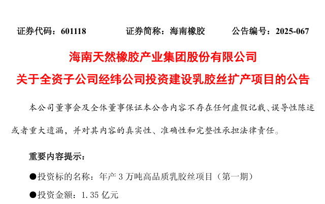 海南橡膠產(chǎn)業(yè)集團(tuán)股份有限公司(證券代碼:601118,簡稱“海南橡膠”)10月31日發(fā)布公告稱,公司全資子公司海南經(jīng)緯乳膠絲有限責(zé)任公司(簡稱“經(jīng)緯公司”)擬投資1.35億元建設(shè)年產(chǎn)3萬噸高品質(zhì)乳膠絲項(xiàng)目(第一期)。項(xiàng)目建成后,經(jīng)緯公司乳膠絲年產(chǎn)能將新增1.5萬噸,進(jìn)一步鞏固其行業(yè)龍頭地位。