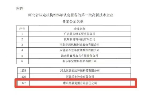在本次公示名單中,唐山黑貓炭黑有限責任公司赫然在列,其序號為1177。值得關注的是,這已是該公司繼2015年、2018年、2022年之后,第四次成功被認定為國家高新技術企業,充分彰顯了企業在技術創新領域的持續深耕與突出實力。