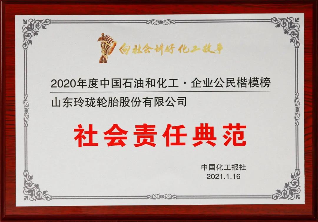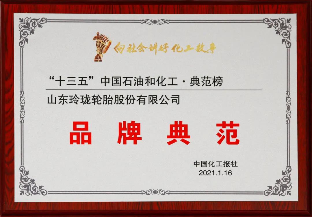 因2020年帶領(lǐng)企業(yè)迎難而上,克服疫情對企業(yè)發(fā)展的沖擊和影響,在提升企業(yè)競爭力、推動行業(yè)高質(zhì)量發(fā)展、履行社會責(zé)任等方面取得的突出成就,玲瓏輪胎董事長、總裁王鋒榮獲“2020年度中國石油和化工行業(yè)影響力人物”稱號。玲瓏輪胎被授予“十三五中國石油和化工·典范榜品牌典范”和“2020年度中國石油和化工·企業(yè)公民楷模榜社會責(zé)任典范”。