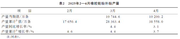 4月份,我國橡膠輪胎外胎產量為10200.2萬條,同比增長率為3.1%;1—4月累計產量為3.86億條,累計增長率為3.7%。