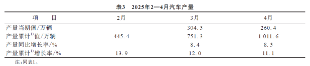 4月份,我國汽車產量為260.4萬輛,同比增長率為8.5%;1—4月累計產量為1011.6萬輛,累計增長率為11.1%。