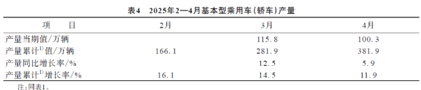 4月份,我國轎車產量為100.3萬輛,同比增長率為5.9%;1—4月累計產量為381.9萬輛,累計增長率為11.9%。