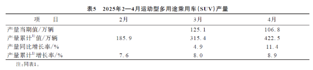 4月份,我國SUV產量為106.8萬輛,同比增長率為11.4%;1—4月累計產量為422.5萬輛,累計增長率為8.9%。