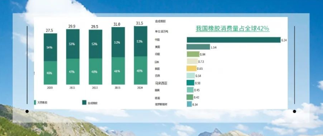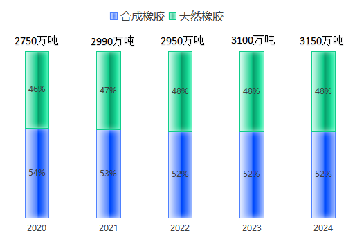 近日,國外機構(gòu)發(fā)布全球橡膠統(tǒng)計數(shù)據(jù),2024年全球橡膠消費量3150萬噸,同比增長1.9%,其中合成橡膠占比52%,天然橡膠占比48%。我國橡膠消費量1322萬噸,全球占比約42%。