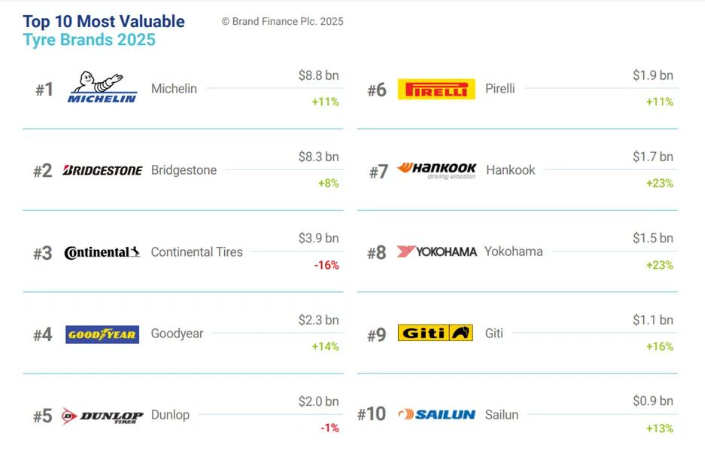 英國品牌評估機構(gòu)“品牌金融”(Brand Finance)發(fā)布“2025全球輪胎品牌價值25強”(Tyres 25 2025)榜單,法國米其林、日本普利司通、德國大陸馬牌蟬聯(lián)前三位,中國品牌賽輪進入前十名。