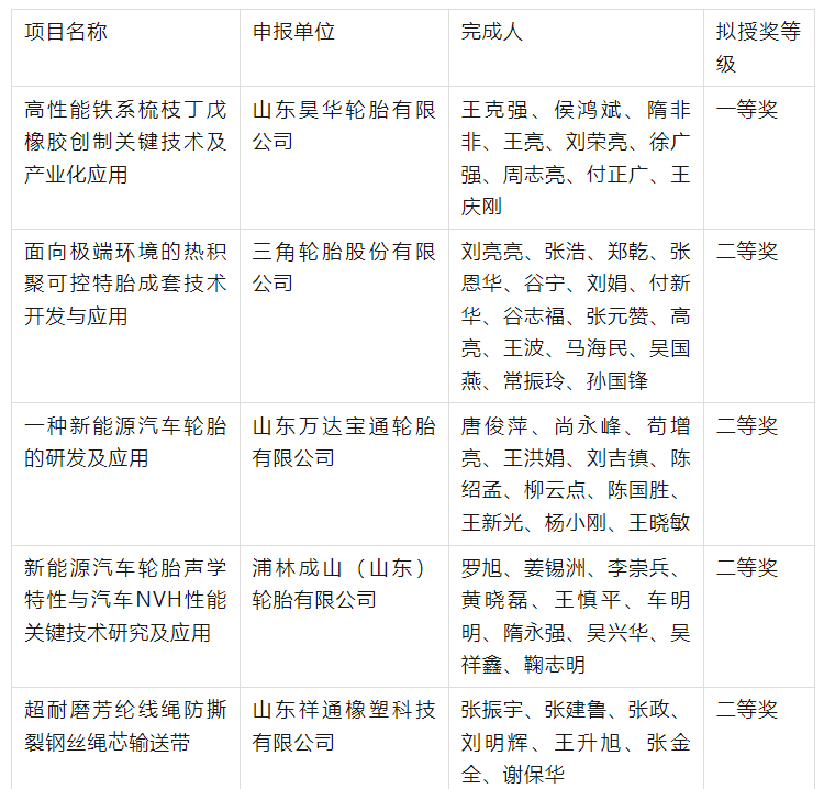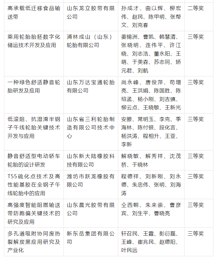2024 年度山東省橡膠行業 科學技術獎擬授獎項目名單