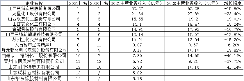 中國橡膠工業協會發布“2021年度中國橡膠工業協會百強企業” 入圍名單公示,其中有14家炭黑企業入選,榜單只統計了2019年四季度與2020年前三季度營業額,前幾位與2020排行相同,整體改動不大。