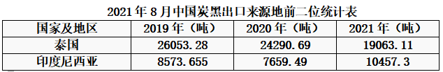 其中,2021年8月我國炭黑出口地主要集中在東南亞地區,向泰國出口量約19063.11噸位列第一,占總出口量的38.24%,其次向印尼出口量10457.3噸,占總出口量的20.98%。