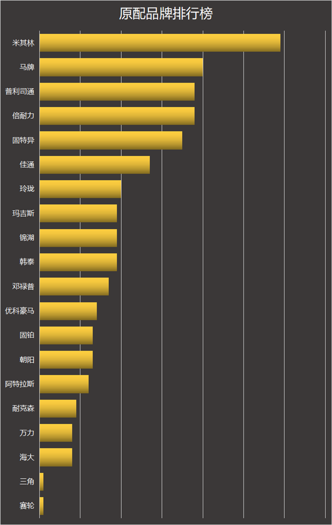 整體的配套數量也比不上外資輪胎企業,位于前6的輪胎原配都是外資輪胎企業,原配的車輛數量占據整體的接近一半,國產輪胎在原配上仍要下足功夫。