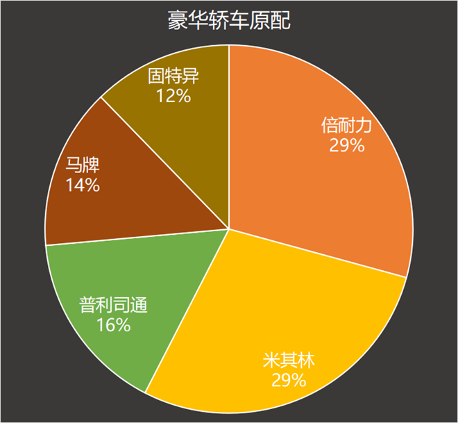 國產輪胎在原配市場已經努力了許久,豪華轎車原配依舊是外資輪胎企業占據話語權,其中倍耐力和米其林尤甚,德國馬牌輪胎在豪華轎車原配市場中也在不斷的搶占市場,目前已經小有成效。